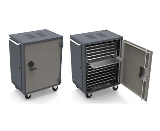 CEKA-AnchorPads unika lösning för säker förvaring, flyttning, laddning och synkronisering av Laptops, iPads/Surfplattor, Mini-Laptops. Vagnen finns i 2 versioner: Small som rymmer upp till 10st Laptops eller 20st iPads/Surfplattor/Mini-Laptops alternativt Large som rymmer 20st Laptops eller 30st iPads/Surfplattor/Mini-Laptops. Vagnen har en mycket säker och solid konstruktion i pulverlackerad stålplåt och är byggd med samma låsmekanism som klassade säkerhetsskåp är utrustade med. Finns i versioner med godkänt nyckellås av högsäkerhetstyp eller med avancerat och godkänt kodlås med många inställningsmöjligheter som är ett bra val om Ni är många användare). Som standard har vagnen 10st uttag (62844) alternativt 20st uttag (62855) men fler uttagslister finns som tillval. Väl tilltagna hål sörjer för god ventilation vid laddning. Som tillval finns Termostatstyrd fläkt (636) om man önskar ha datorerna i drift, exempelvis vid uppdateringar nattetid (fläkt behövs ej vid endast laddning). Specialhjul gör vagnen mycket lättmanövrerad. Som tillval finns tillbehör för förankring mot vägg eller kring annat fast föremål, monteringshylla för skrivare, portabel tröskelplåt som gör det enkelt att köra även över höga trösklar samt Ladd/Synkenhet eller Laddstation för iPads/Surfplattor. Mått utvändigt: (HxBxD): 1000x685x520 mm (Small) / 1000x910x520 mm (Large).